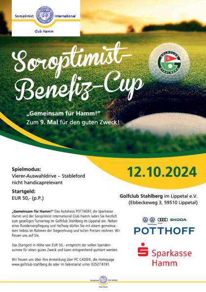 Bereits zum 10. Mal haben der Soroptimist Club Hamm, die Sparkasse Hamm und das Autohaus Potthoff zum Soroptimist-Benefiz-Cup eingeladen. Bei angenehmem Golfwetter wurde für den guten Zweck eine Summe von 2.160 € erspielt.