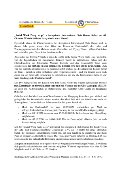 „Social Work Party to go“ - Soroptimist International Club Hamm lieferte am 03. Oktober 2020 die beliebte Party direkt nach Hause!
